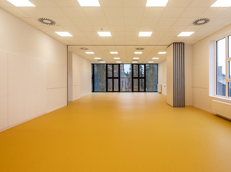 "The school buildings were in a poor technical state and no longer met the needs of the school," says architect Delphine Bostoen. "The different locations also made it difficult for the school to function. Both the sanitary facilities and the refectory were very outdated, there was a need for a gymnasium and there was also a capacity problem. The school therefore wanted six new classrooms, a gymnasium with associated changing rooms, new toilets and a dining area with supporting accommodation."